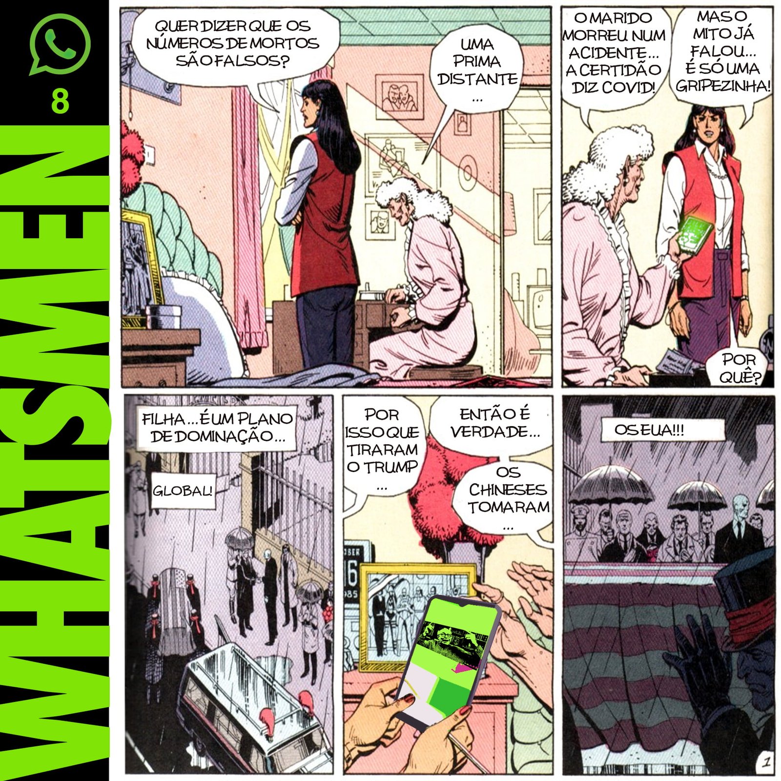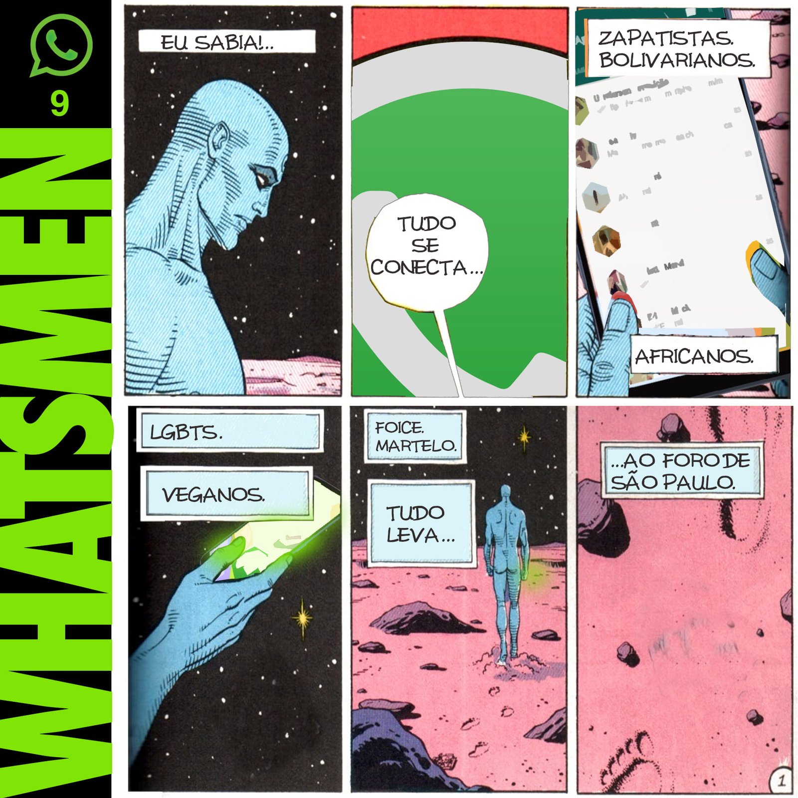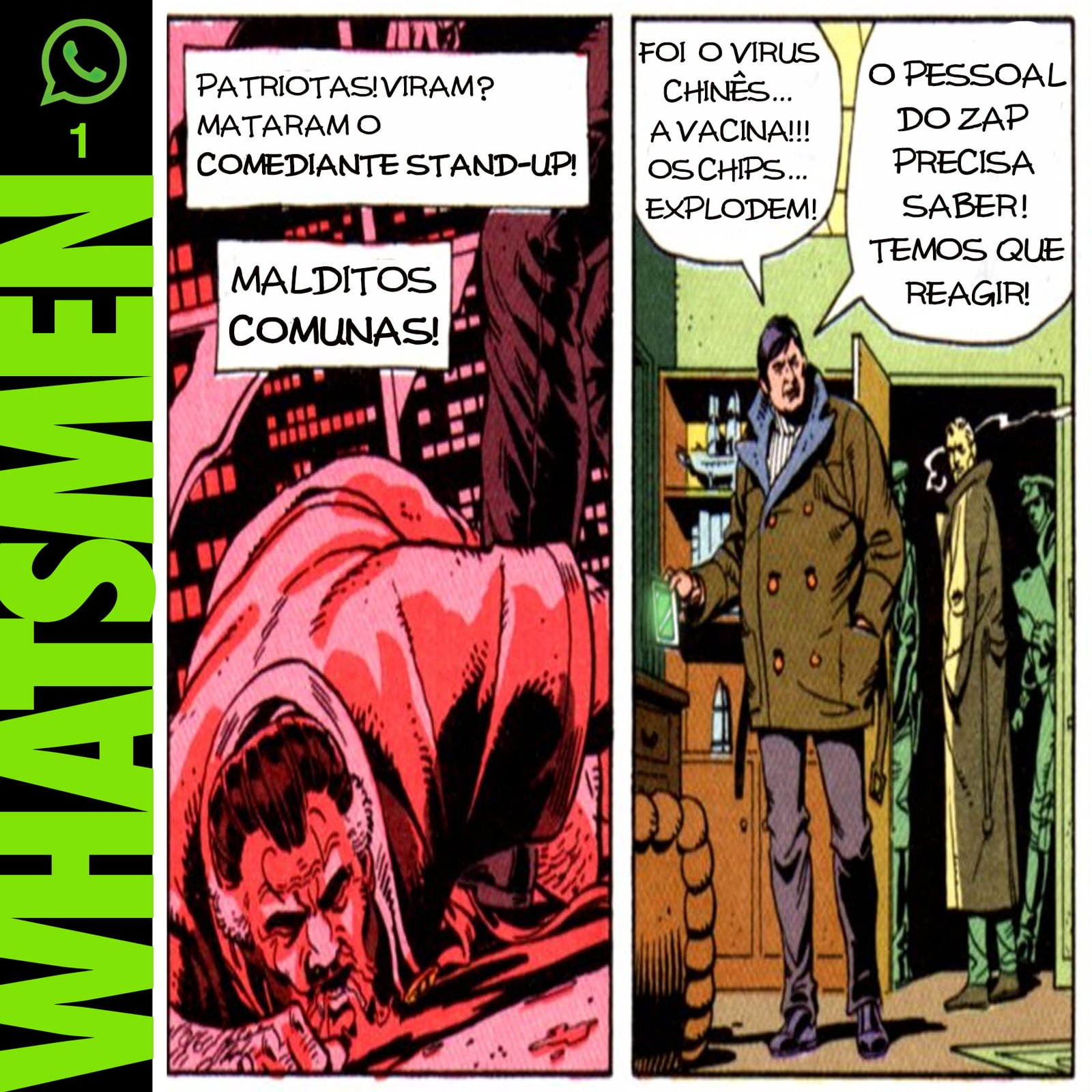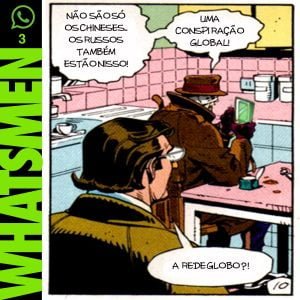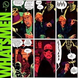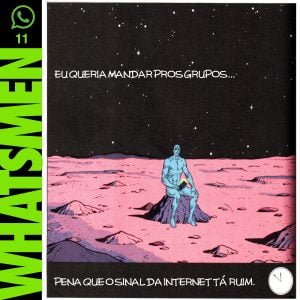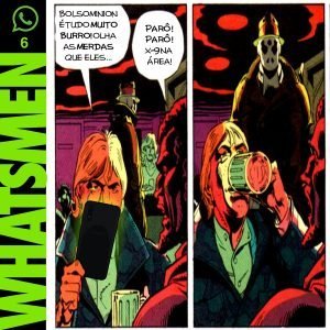“Whatsmen” é uma paródia da célebre HQ Watchmen, de Alan Moore e Dave Gibbons, publicada em 1986. Atualizada para o Brasil paranoico e opressor dos dias de hoje, nos quais as pessoas se informam por fake news disseminadas em redes sociais. O “remix” da HQ original foi realizado por Thiago Fonseca, baixista da banda Alcoóliques, que eventualmente faz quadrinhos.