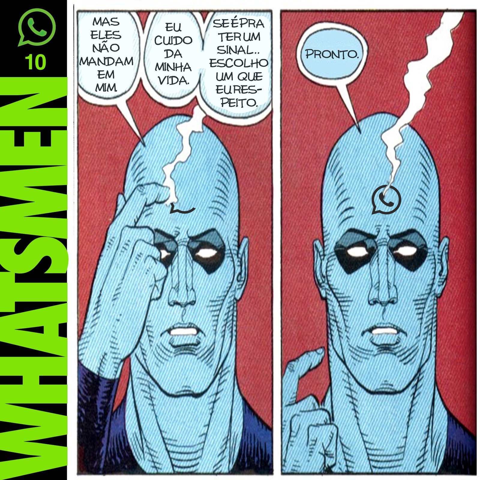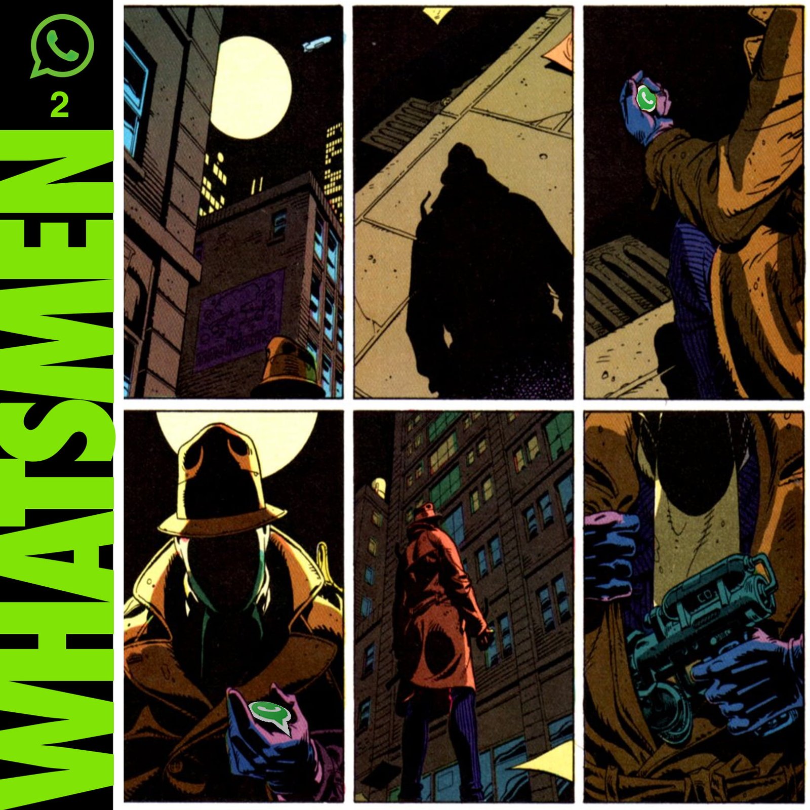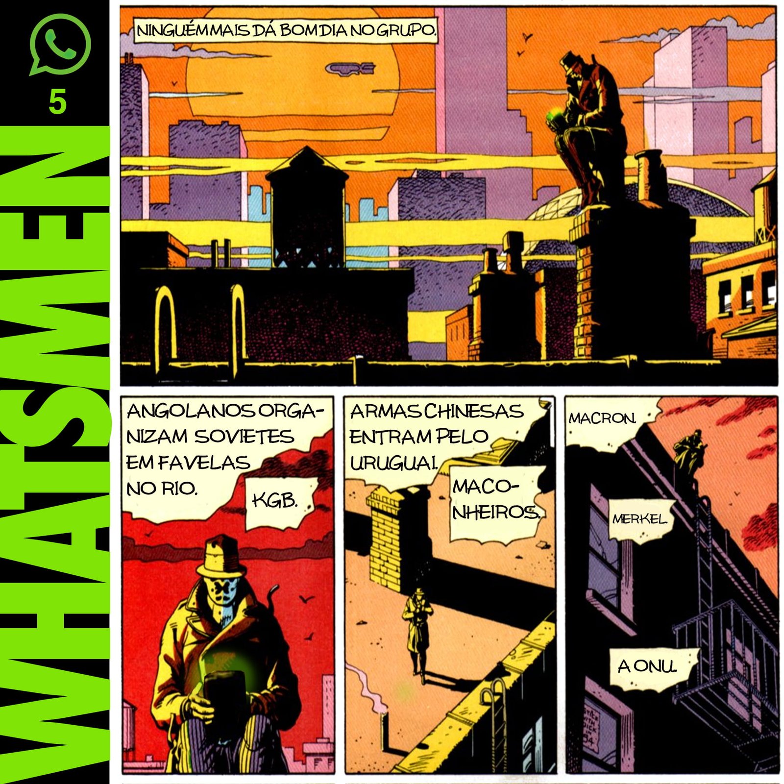 “Whatsmen” é uma paródia da célebre HQ Watchmen, de Alan Moore e Dave Gibbons, publicada em 1986. Atualizada para o Brasil paranoico e opressor dos dias de hoje, nos quais as pessoas se informam por fake news disseminadas em redes sociais. O “remix” da HQ original foi realizado por Thiago Fonseca, baixista da banda Alcoóliques, que eventualmente faz quadrinhos.