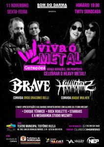 “Viva O Metal – Gerações” será realizado no dia 11 de Novembro a partir das 19h no Teatro Municipal Teotônio Vilela, em Sorocaba/SP. Com shows especiais de duas já experientes bandas: o Brave que, durante seu set, contará com a participação especial do grupo de performance medieval Ordo Draconis Belli, e o Hammathaz, que convida para uma participação muito especial a unidade de Sorocaba do grupo feminista de maracatu Baque Mulher.