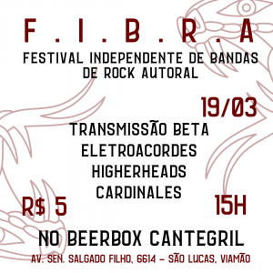 F.I.B.R.A. consolida cena independente com mais uma edição em Viamão promovendo o rock autoral. Nesta edição do Festival participam as bandas Eletroacordes, Cardinales, Transmissão Beta e Higherheads com músicas autorais e produção independente. A organização é do músico e produtor Lauro Levandowski e será no dia 19 de março, domingo, a partir das 15h, no Beer Box Cantegril (RS), com ingresso à venda.