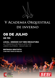 São Paulo, 28 de junho de 2023 – O amor pela música erudita reúne no sábado (08), a partir das 11h, os treze Núcleos de Música do SESI-SP, no Ginásio do CAT SESI Indaiatuba para o encerramento da V Academia Orquestral da Instituição, que celebra os 10 anos dos Núcleos de Música de Cordas Friccionadas do SESI-SP. O evento é gratuito e conta com o apoio do Instituo Camões – Instituto da Cooperação e da Língua Portugal.