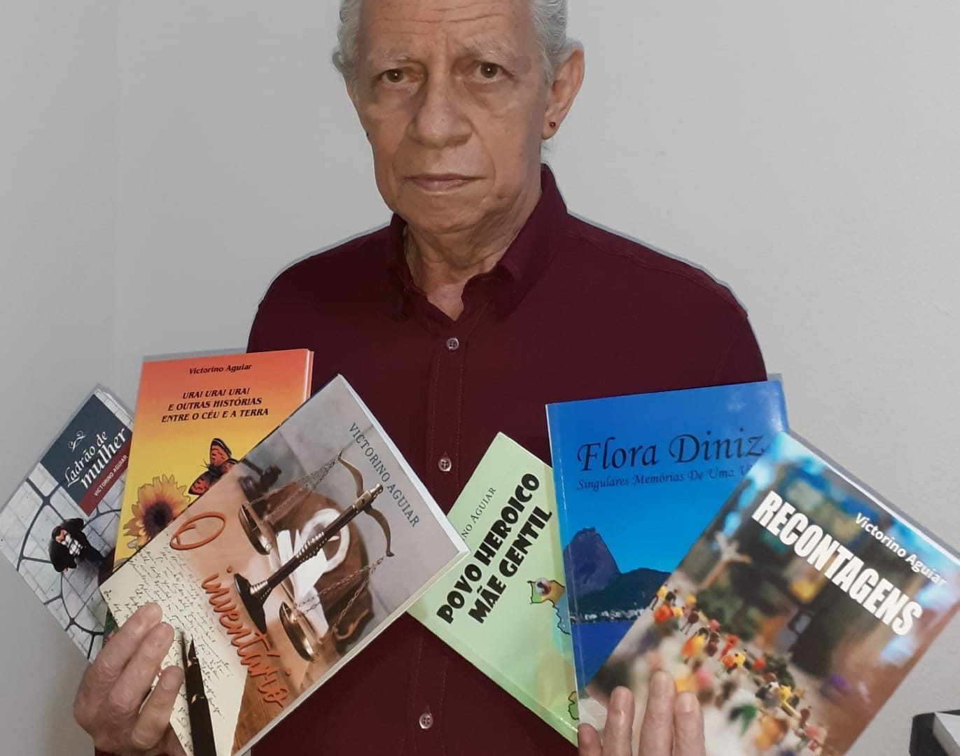Durante muito tempo Victorino Aguiar produziu e guardou na gaveta centenas de textos, a maioria dos quais ele destruiu. Foi só em 2006 que ele conseguiu publicar o primeiro livro de contos, “URA! URA! URA! e outras histórias entre o Céu e a Terra”.
